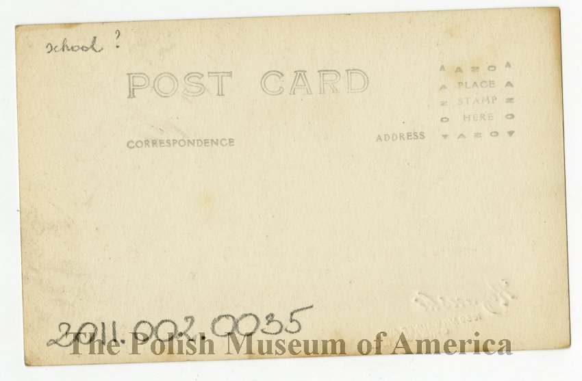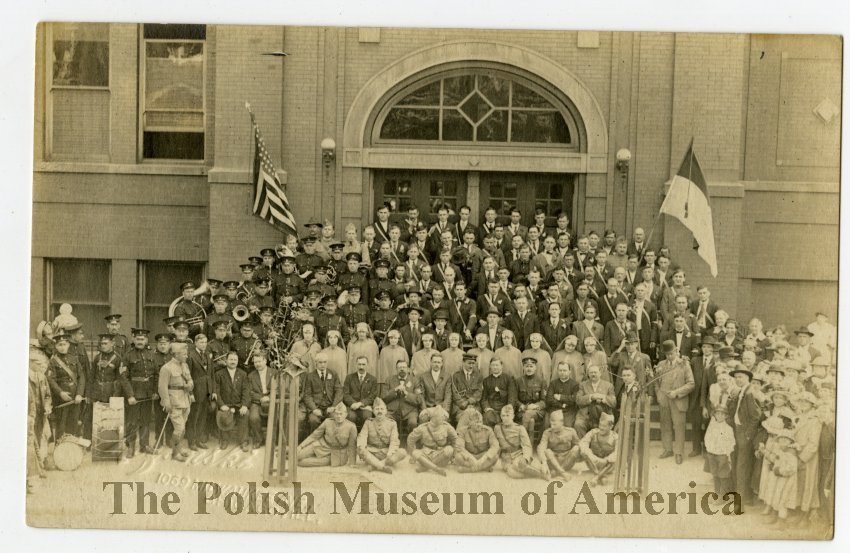 Photographic, black and white postcard depicting a group of people in front of an unidentified building; above the crowd visible are American and Polish Flags; among the crowd visible are Gray Samaritans and members of the Polish Army in military uniforms.