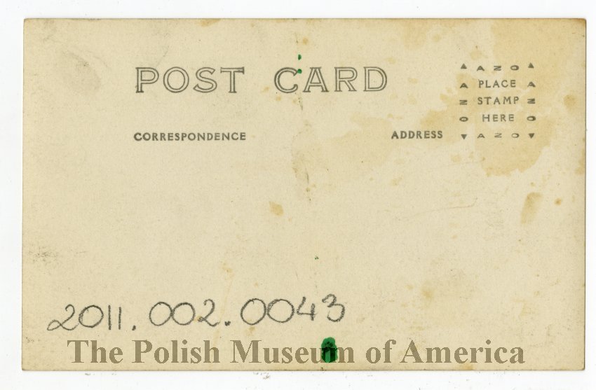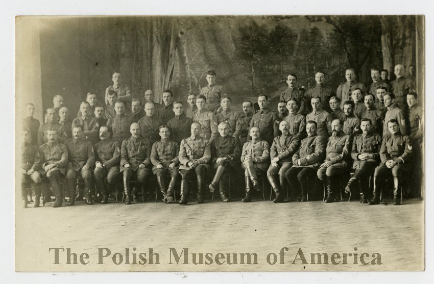 Photographic, black and white postcard depicting members of the Polish Army in France, posing in front of a studio backdrop.