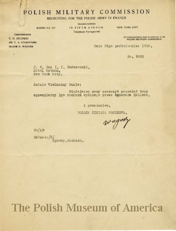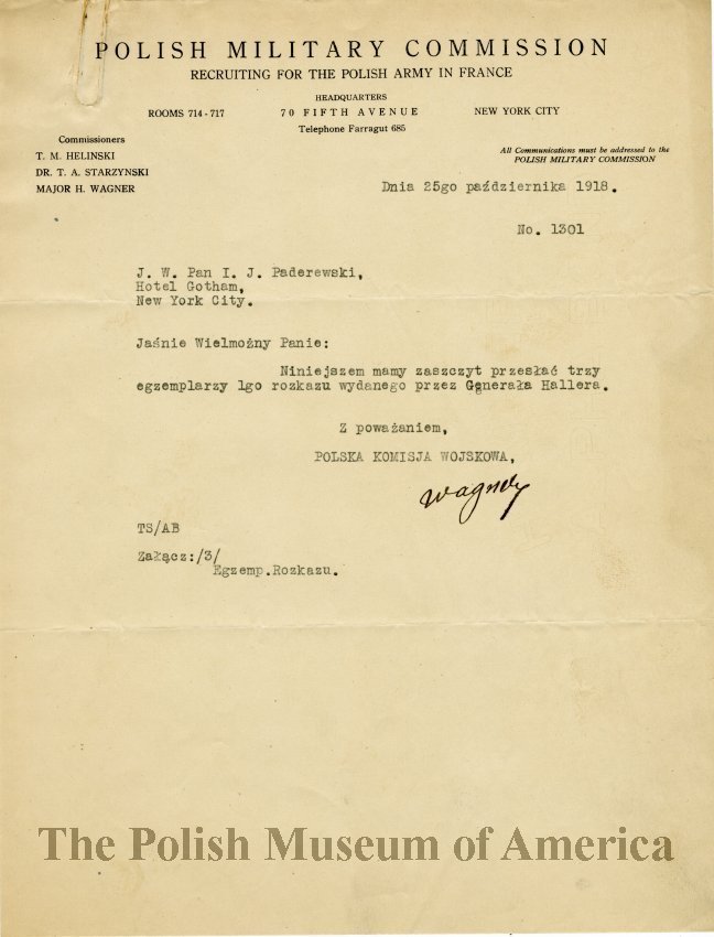 Drukowany "Rozkaz dzienny generala Hallera" wraz z maszynowa notatka, wyslane do I. J. Paderewskiego przez komisarzy Polskiej Komisji Wojskowej dnia 25 pazdziernika 1918 roku.