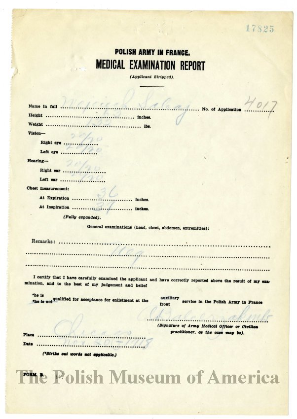 Dokumenty rekrutacyjne Armii Polskiej we Francji – akt zgloszenia, karta zgloszenia i raport medyczny – Wojciech Sabaj