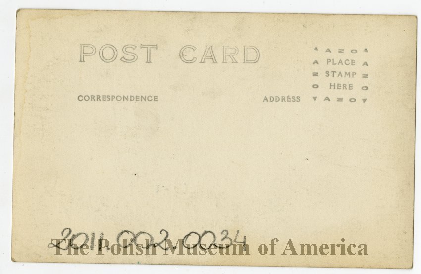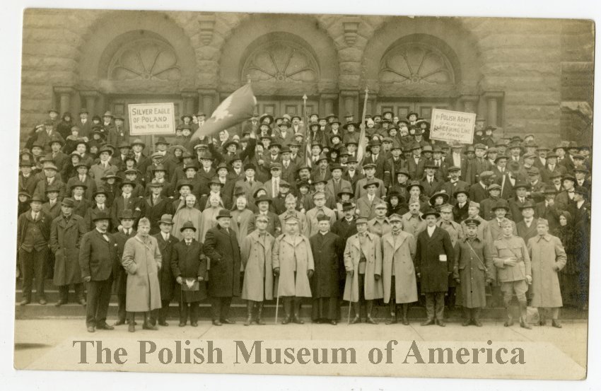 Photographic, black and white postcard depicting a group of people in front of an unidentified building (church?); above the crowd visible are American and Polish Flag along with signs supporting Polish Army in France and flag with the white eagle; among the crowd visible are Gray Samaritans and members of the Polish Army in military uniforms.