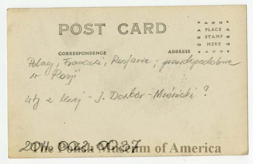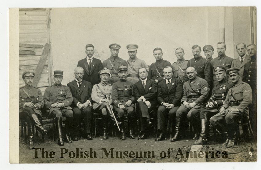 Photographic, black and white postcard depicting a group of men, some in military uniforms: Blue Hallers Army, French army and Russian army; most probably in Russia. 1917–1918?
