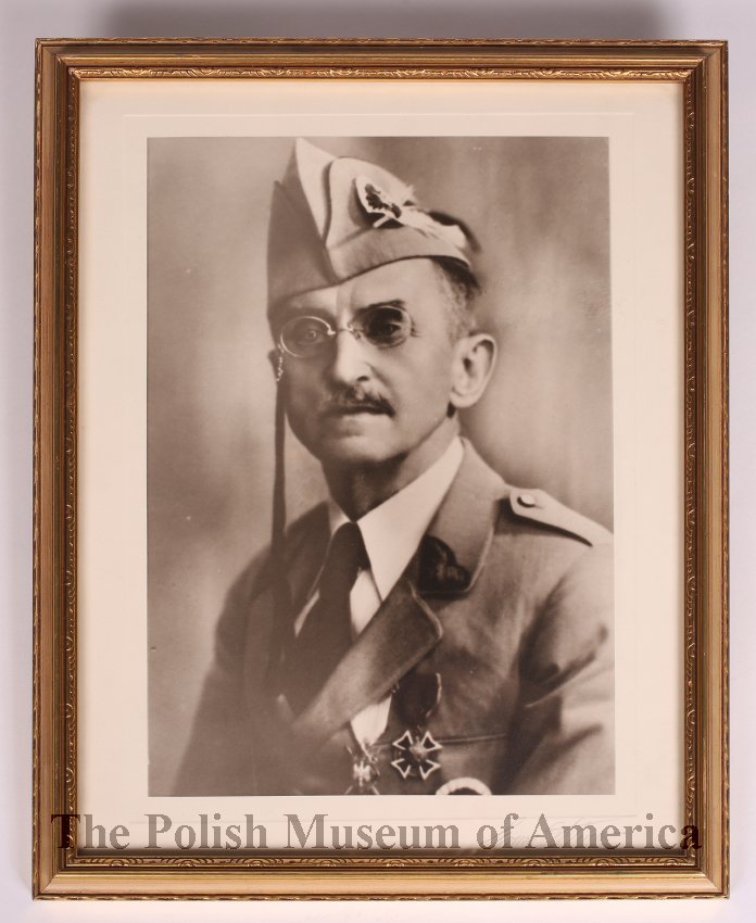 Framed photographic portrait of Stanislaw Osada, journalist with Gen. Haller's Polish Army in France (the Blue Army) during World War I. The photo depicts S. Osada in his post World War I Polish Falcons uniform.