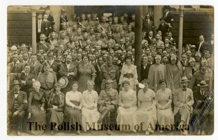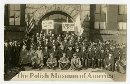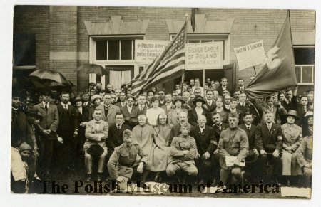 - Photographic, black and white postcard depicting a group of people in front of an unidentified building; above the crowd visible are American Flag and Polish Flag along with signs supporting Polish Army in France; among the crowd visible are Gray Sa... View Full Record
