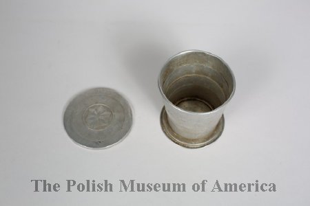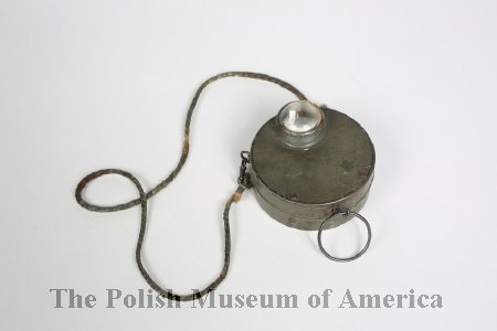 - A blue fabric covered flask with leather strap, from the time of World War I, used by the soldier of the Polish Army in France.