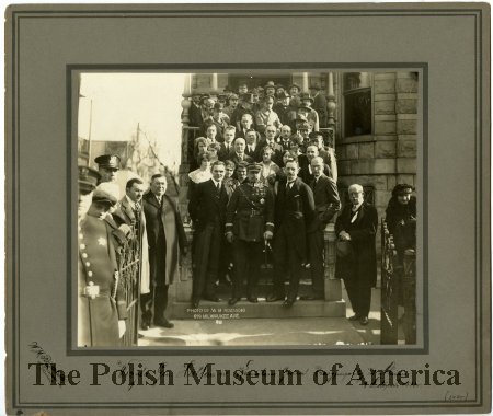 - Black and white photograph depicting I. J. Paderewski and volunteers for the Polish Army in France in front of the Holy Trinity Church in Chicago, 1917 or 1918.